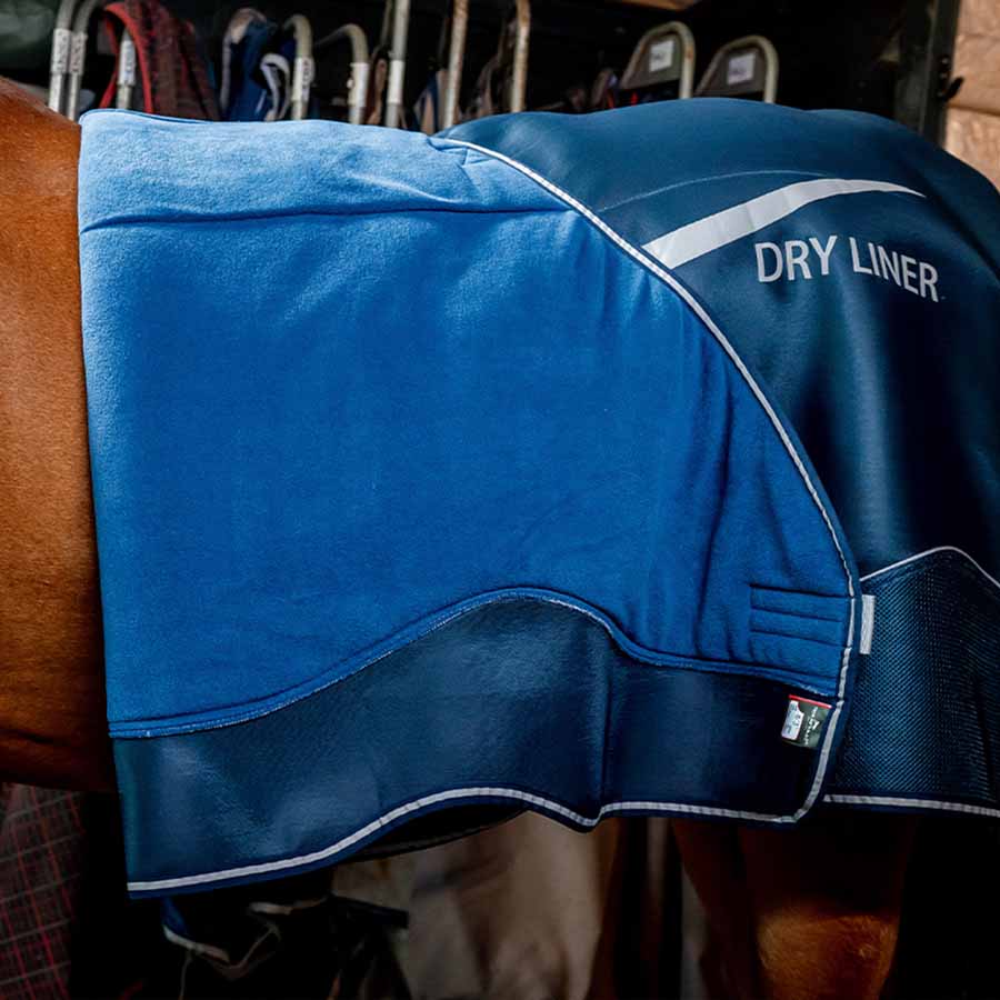 Horseware heeft haar marineblauwe Dry Rug ontwikkeld met behulp van een innovatief drielaags ontwerp, een soort technologie waarbij elke laag zijn eigen doel heeft. Wanneer deze lagen vervolgens gecombineerd worden, worden ideale omstandigheden voor vochtverdamping naar boven gecreëerd, dit gebeurt zonder dat enig vocht wordt overgebracht naar de binnenkant van de buitenste laag.