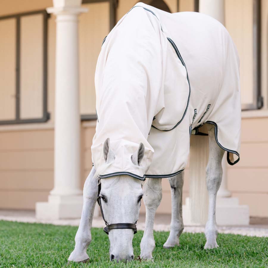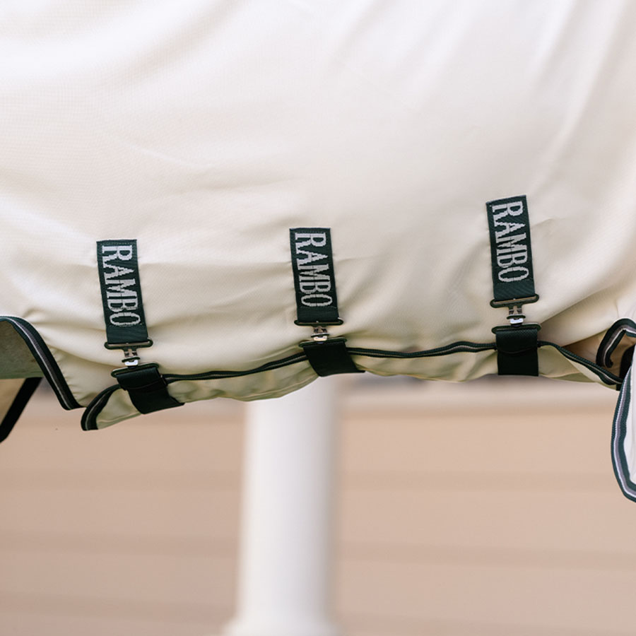 De Rambo Hoody XL is gemaakt van hoogwaardig, goed geventileerd meshmateriaal met 1000D ripstop en effectieve UV-bescherming. De deken is voorzien van een extra grote staartflap en een hals met geïntegreerde kap die over de oren loopt. Daarnaast heeft de deken een zijdeachtig gladde voering bij manen, schouders en staart om wrijving en schuurplekken te helpen voorkomen.