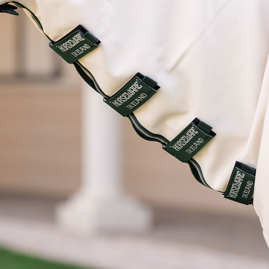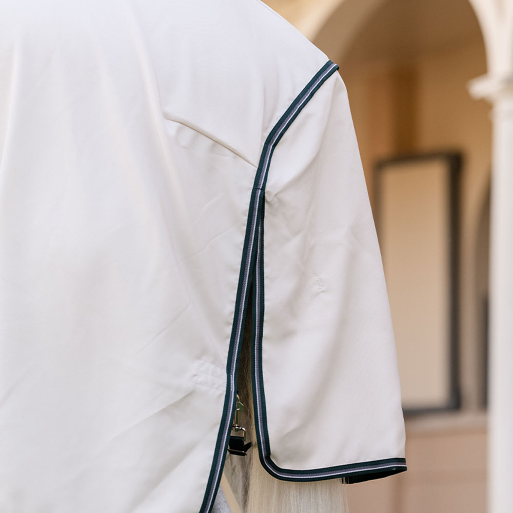 De vliegendeken sluit met een stevige V-frontsluiting die, in combinatie met de hoge beenbogen, maximale bewegingsvrijheid en een optimale pasvorm biedt. Onder de buik bevinden zich drie rechte buiksingels en achteraan een afneembaar staartkoord.