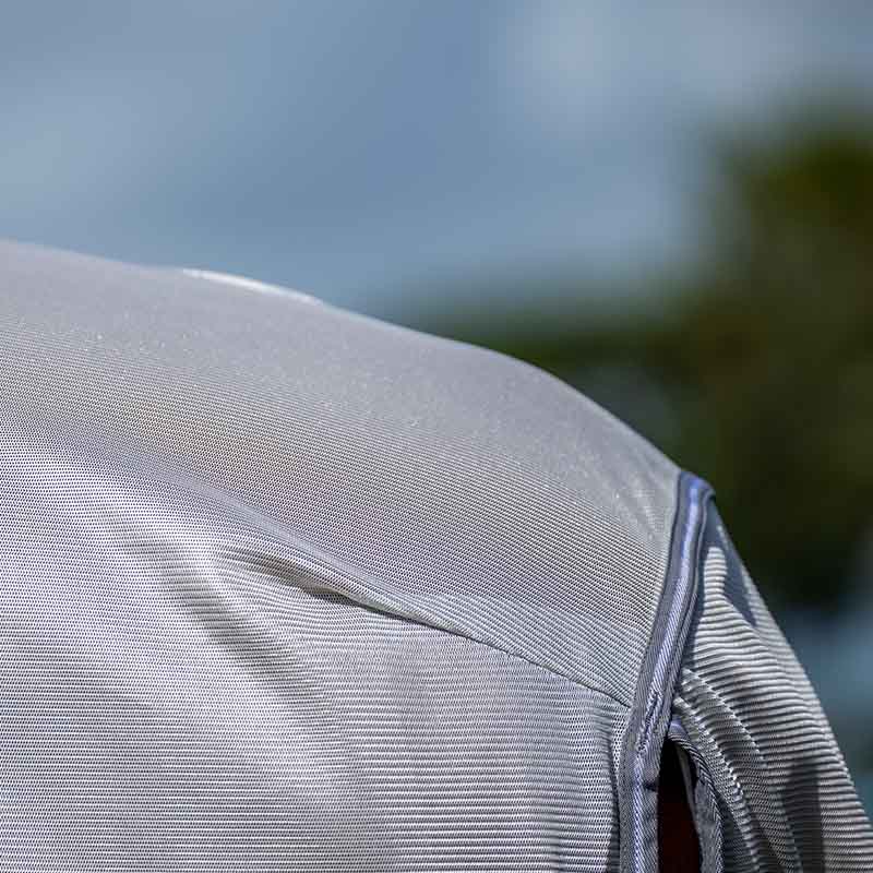 De deken is gemaakt van een zacht, dicht geweven meshmateriaal dat zowel licht als duurzaam is en ongeveer 65% UV-bescherming biedt. Het materiaal helpt het paard te beschermen tegen zowel zonnestralen als hinderlijke insecten. Voor extra comfort is er een zijdeachtig gladde voering over de manen, schouders en in de extra grote staartflap, wat helpt wrijving tegen de vacht te verminderen en een glanzendere vacht te bevorderen.