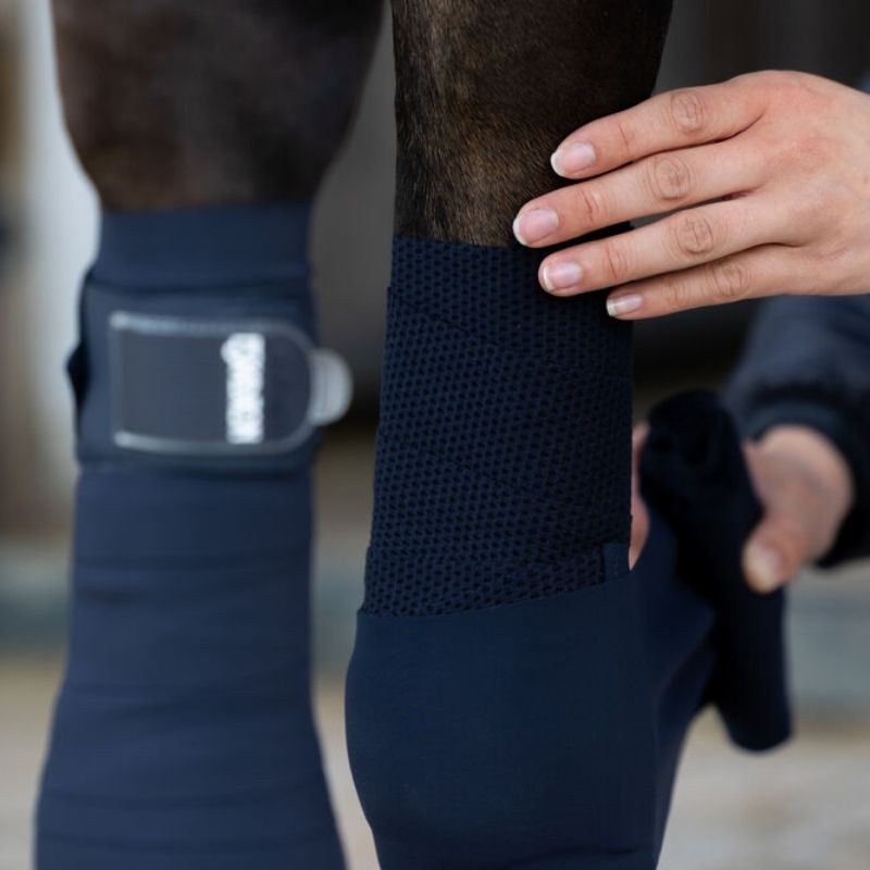 De ESKADRON Softshell Mesh Bandages combineren softshell en mesh voor uitstekende ademend vermogen. Deze marineblauwe bandages worden geleverd in een set van vier en zijn verpakt in een handige tas met ritssluiting. Elke bandage meet 250 cm x 10,5 cm, wat zorgt voor een goede pasvorm en dekking.