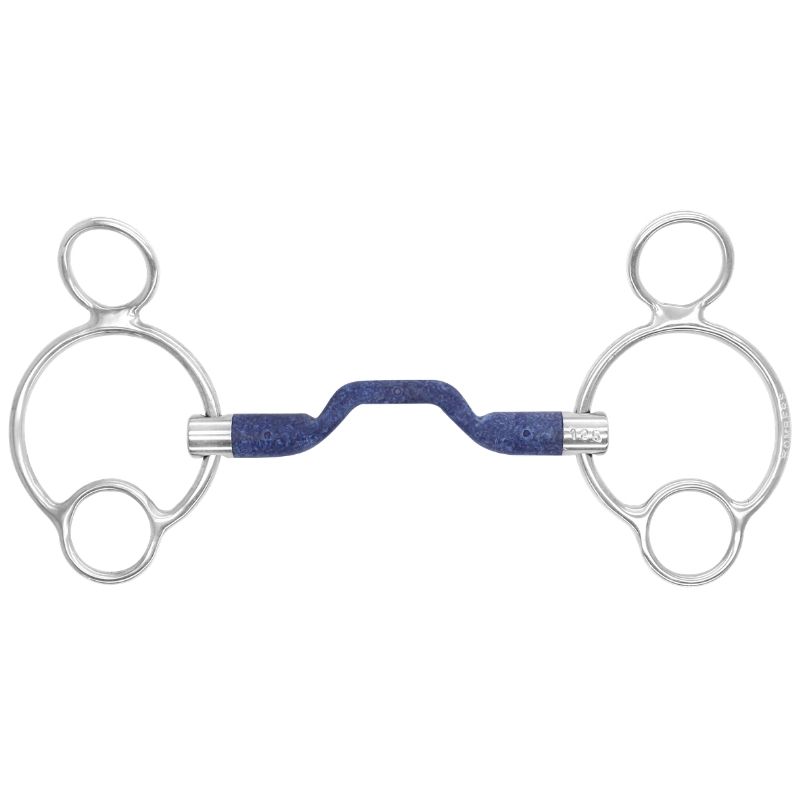 De 2,5-ring Bomber Blue van Bombers is een multi-ring bit dat druk op de nek combineert met een milde hefwerking op het mondstuk. Deze 2,5-ring variant is de mildste in zijn categorie, dankzij de halve ring die de hefwerking vermindert en zorgt voor een zachtere inwerking vergeleken met modellen met meer volledige ringen. Ook bekend als een Pessoa-bit, heeft de Bomber Blue een uniek mondstuk met tongvrijheid en het lichte synthetische materiaal maakt het comfortabel in de mond van het paard en stimuleert tegelijkertijd de speekselproductie.