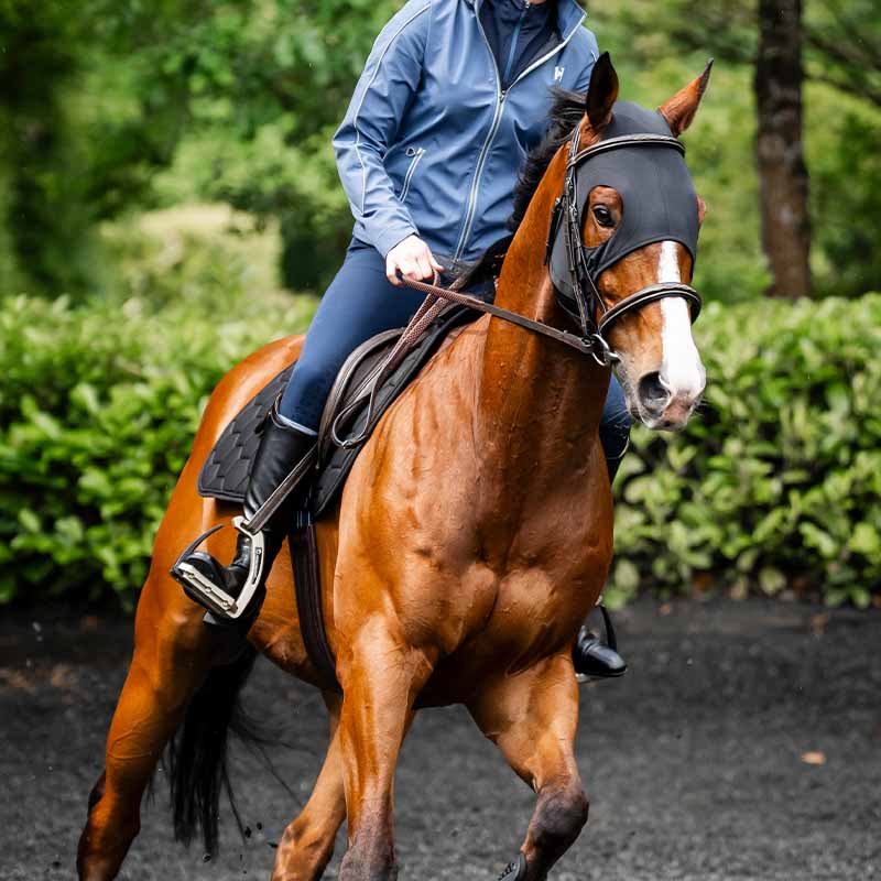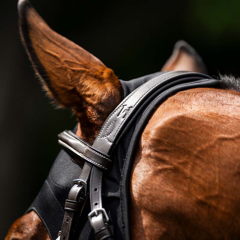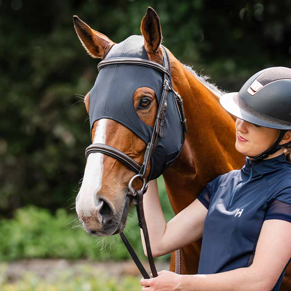 Het ontwerp heeft ruime en zorgvuldig gevormde openingen voor de ogen en oren, wat zorgt voor een comfortabele pasvorm zonder de beweging of het zichtveld van het paard te beperken. Het masker blijft op zijn plaats dankzij een verstelbare elastische klittenbandsluiting onder de kaak.