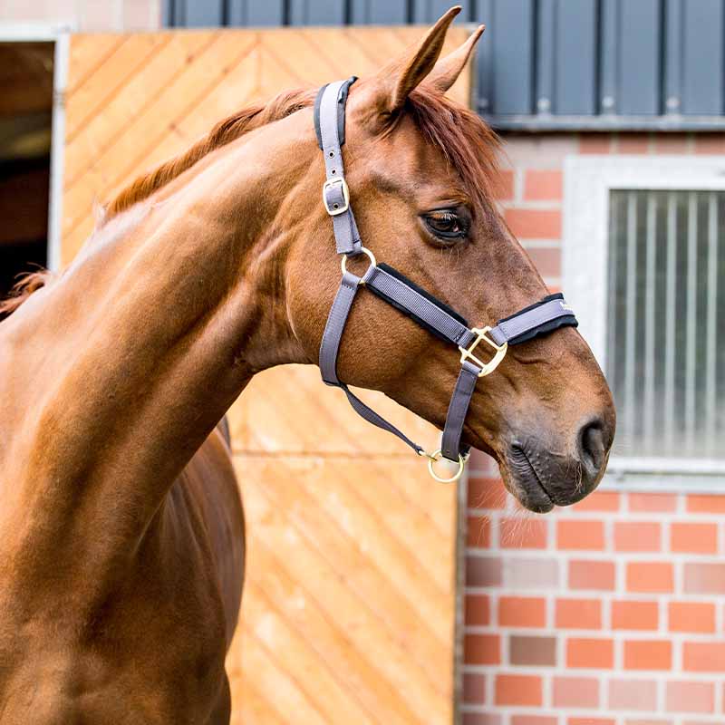 Het grijze halster is ontworpen met mooie goudkleurige metalen gespen en kan eenvoudig worden versteld rond de neusriem en bakstukken om perfect bij je paard te passen.