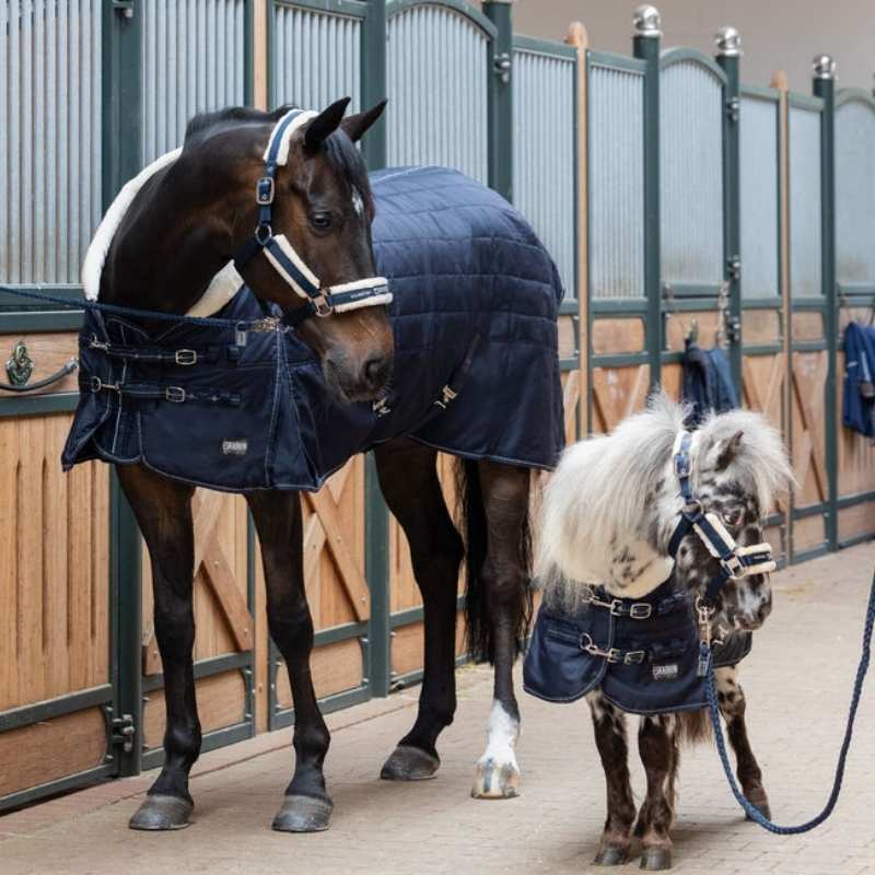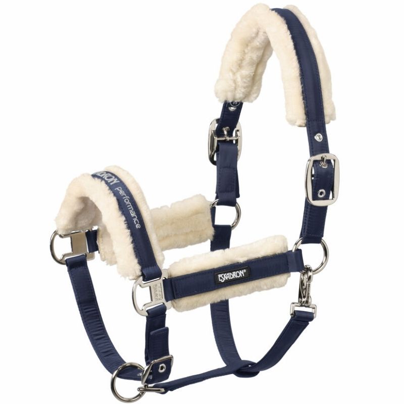 De Eskadron Halster Fauxfur Double Pin in marineblauw is een halster van hoge kwaliteit met een glanzende buitenstof en duurzaam webband aan de binnenkant. Het heeft dubbele pin-gespen voor symmetrische aanpassing en is ook verstelbaar onder de kin. Het halster is uitgerust met onderhoudsvriendelijke, afneembare FauxFur-voering op de neus, nek en bakstukken, wat extra comfort biedt voor je paard.