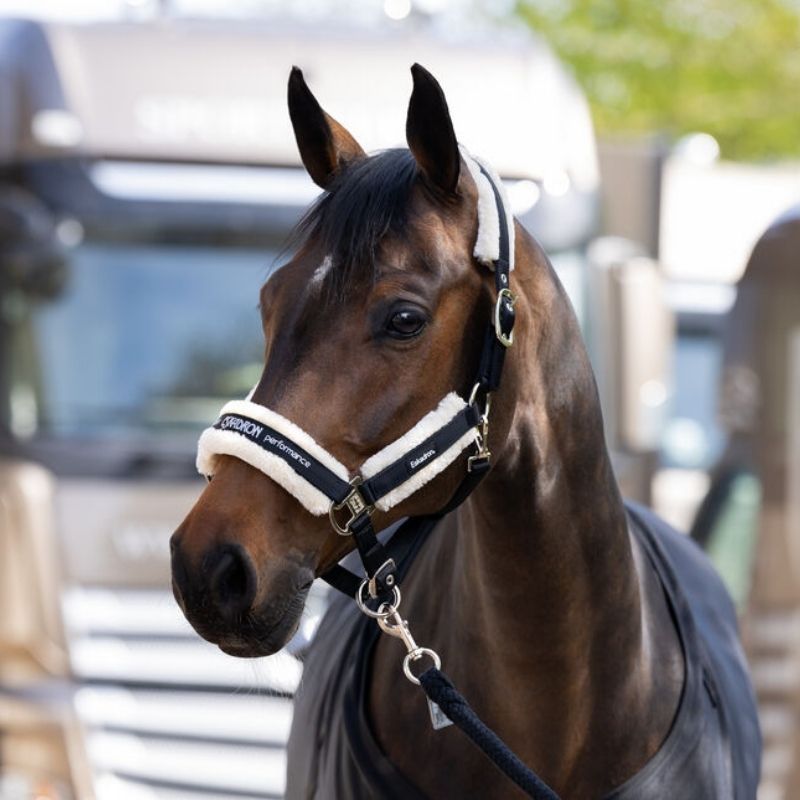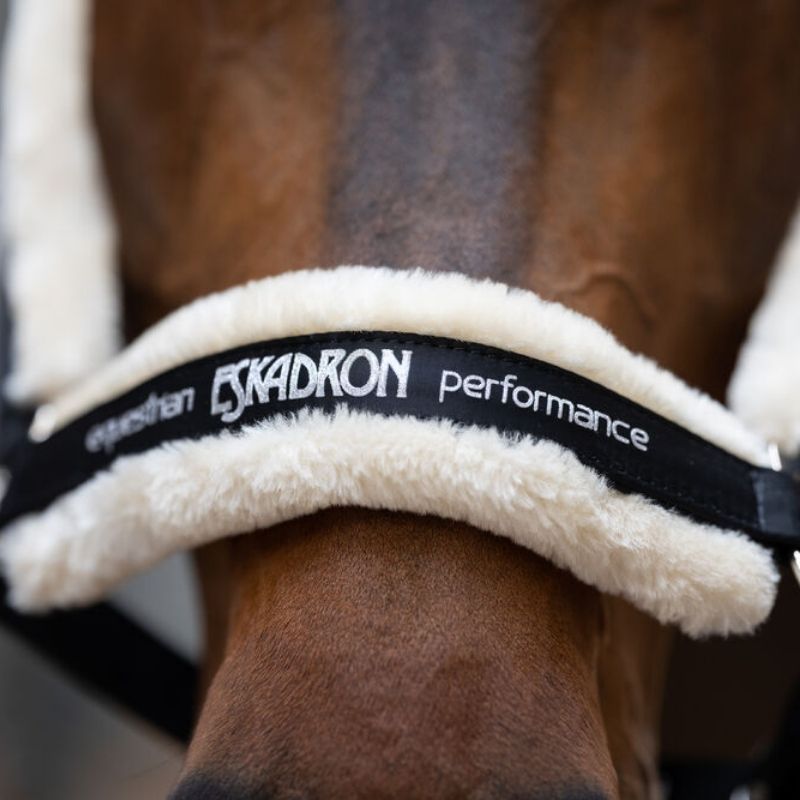 De Eskadron Halster Fauxfur Double Pin in zwart is een hoogwaardig halster met een glanzende buitenstof en duurzaam webbing aan de binnenkant. Het beschikt over dubbele pin gespen voor symmetrische aanpassing en is ook verstelbaar onder de kin. Het halster is uitgerust met onderhoudsvriendelijke, afneembare FauxFur voeringen op de neus, nek en bakstukken, wat extra comfort voor het paard biedt.