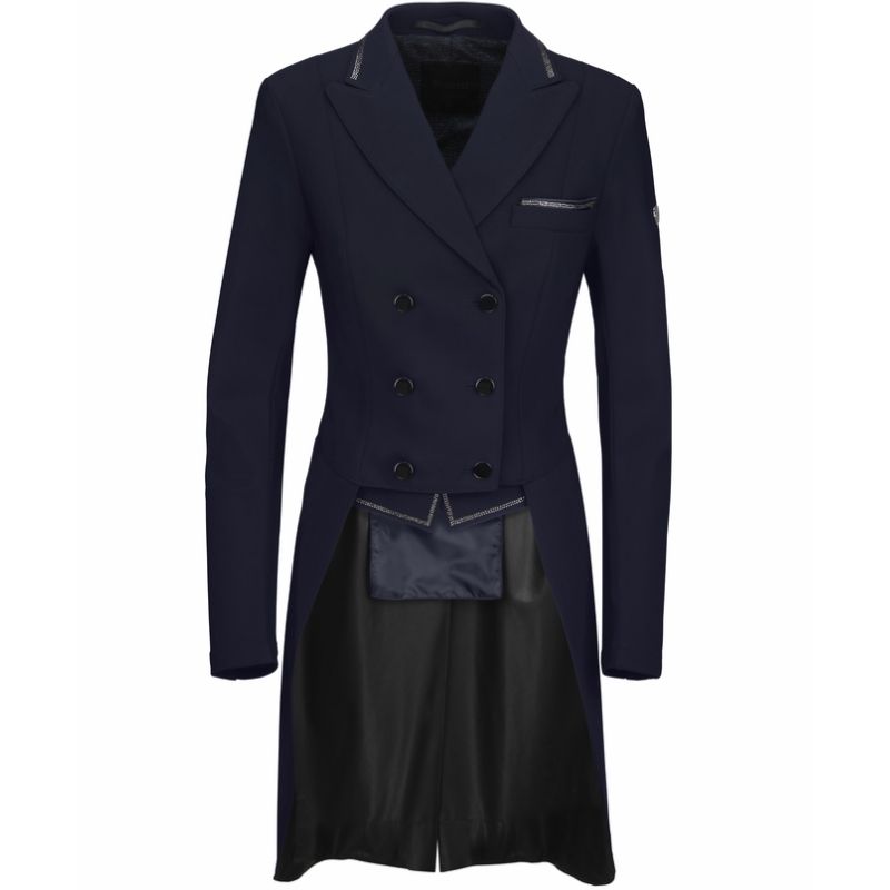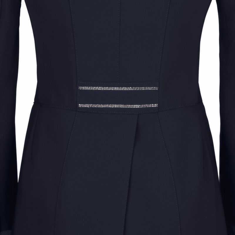 Strategisch geplaatste mesh-panelen langs de zijkanten en onder de armen, gecombineerd met een lucht-doorlatende mesh-voering, verbeteren de ventilatie precies waar het het meest nodig is. Deze doordachte constructie ondersteunt optimale temperatuurregeling zonder afbreuk te doen aan het verfijnde uiterlijk van de frack. Visueel maakt de Liliane frack indruk met verfijnde rhinestone applicaties die subtiel het licht vangen. Deze elegante details worden herhaald op de kraag en tailleband, wat zorgt voor een samenhangende en gepolijste look.