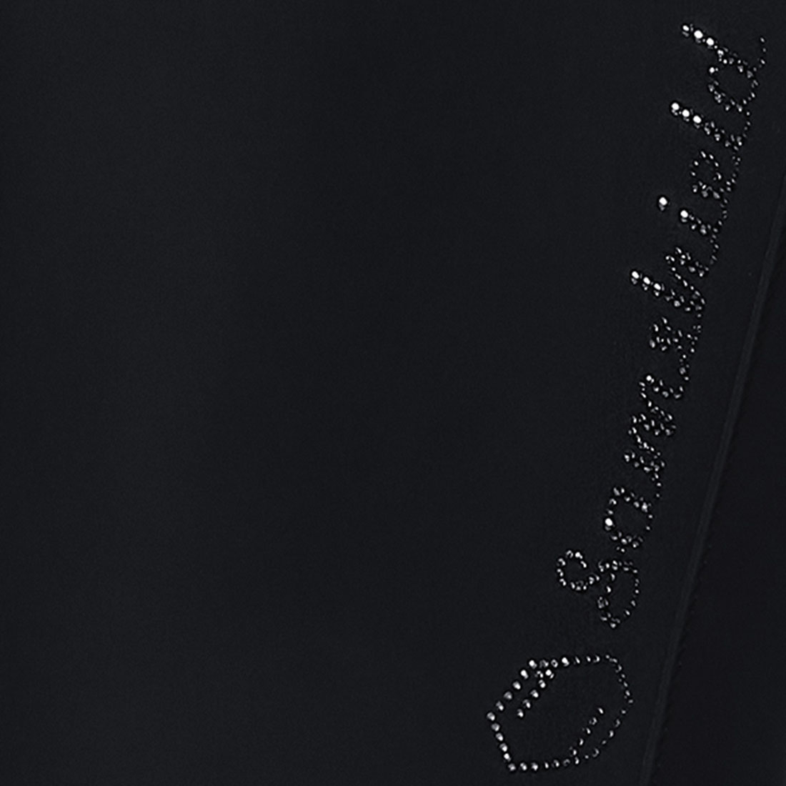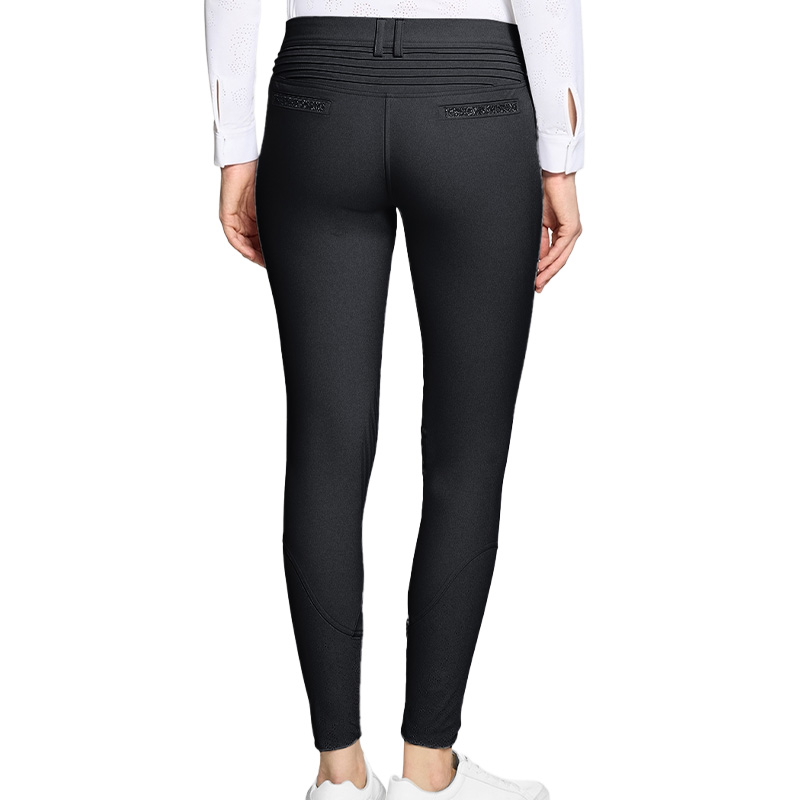 De rijbroek is voorzien van Swarovski kristalstof details bij de riemlussen en achterzakken, evenals plooien aan de achterkant. Een Swarovski-logo is geplaatst op het bovenbeen.