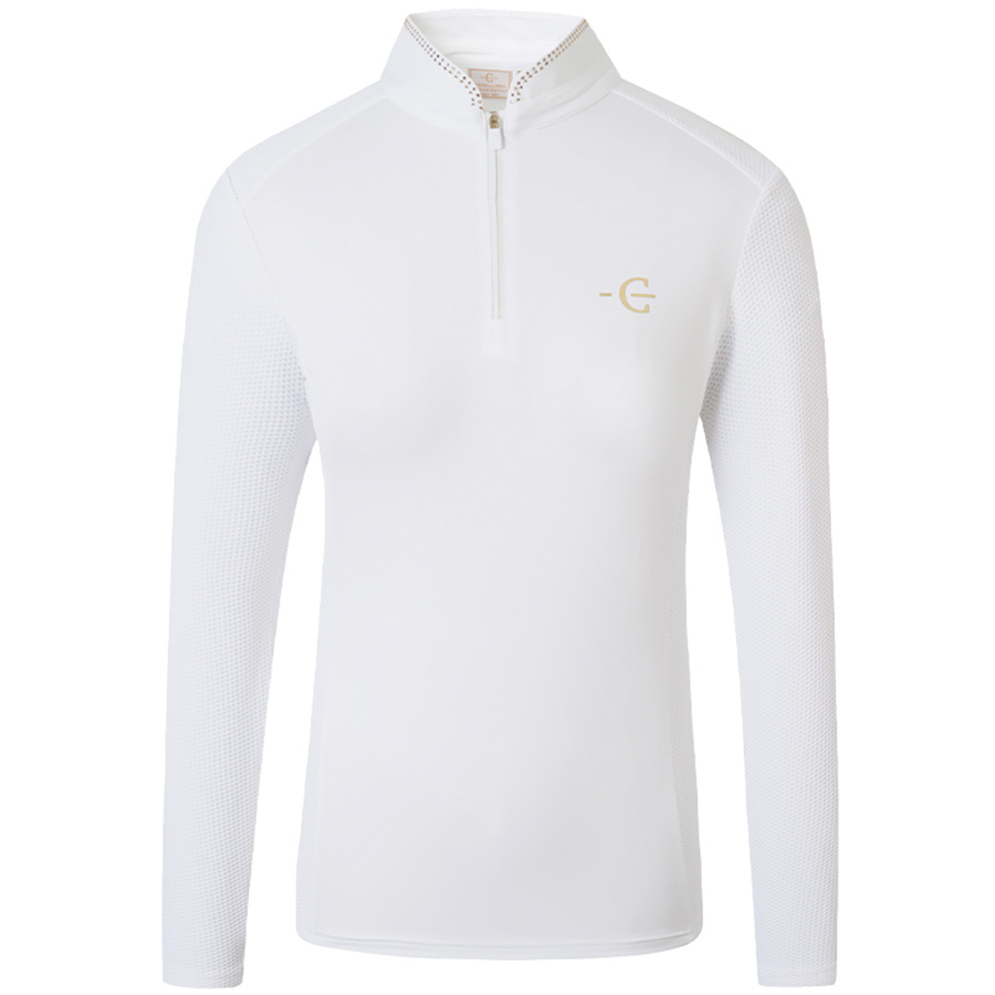 De witte, langarmige wedstrijdtop van Covalliero is gemaakt van een licht en functioneel materiaal met een goed ademend vermogen en vochtregulerende eigenschappen, ideaal voor de meest intensieve wedstrijddagen.