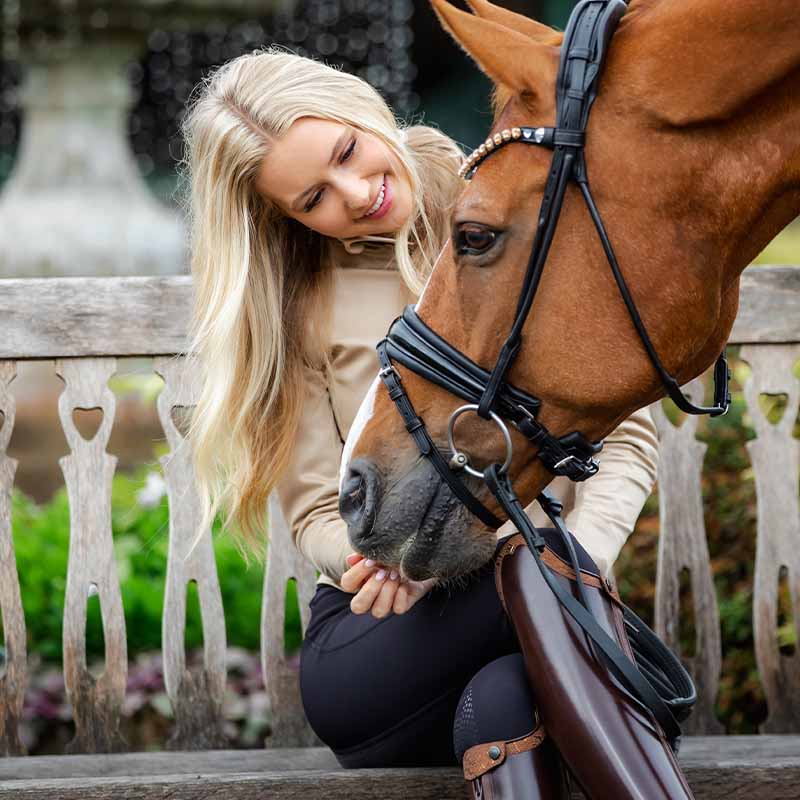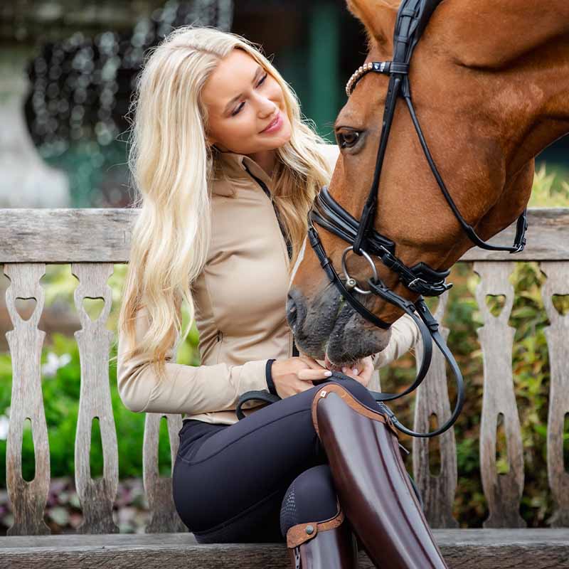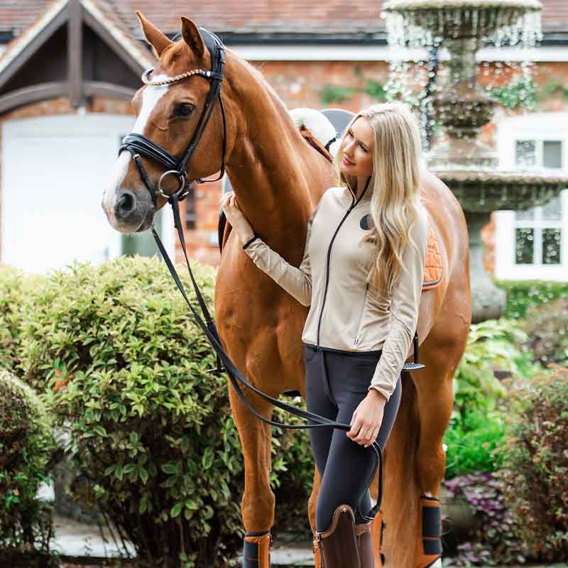 De stof heeft 4-way stretch voor onbeperkte bewegingsvrijheid, of je nu rijdt of in de stal werkt. De trui is voorzien van een hoogwaardige, volledige ritssluiting aan de voorkant, waardoor hij gemakkelijk aan en uit te trekken is en een verstelbare pasvorm biedt. Het design is strak en afgewerkt met een patchdetail voor een verzorgde en elegante uitstraling.