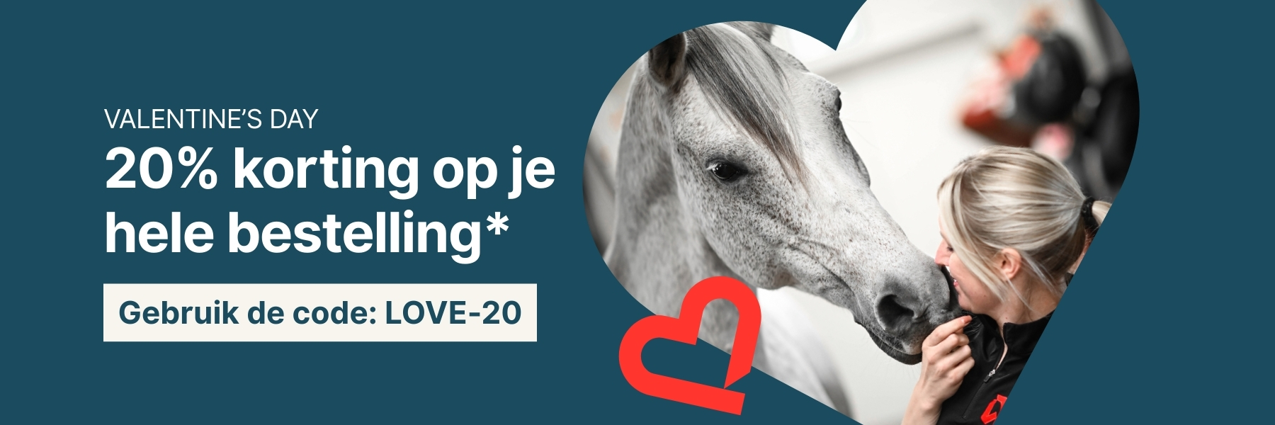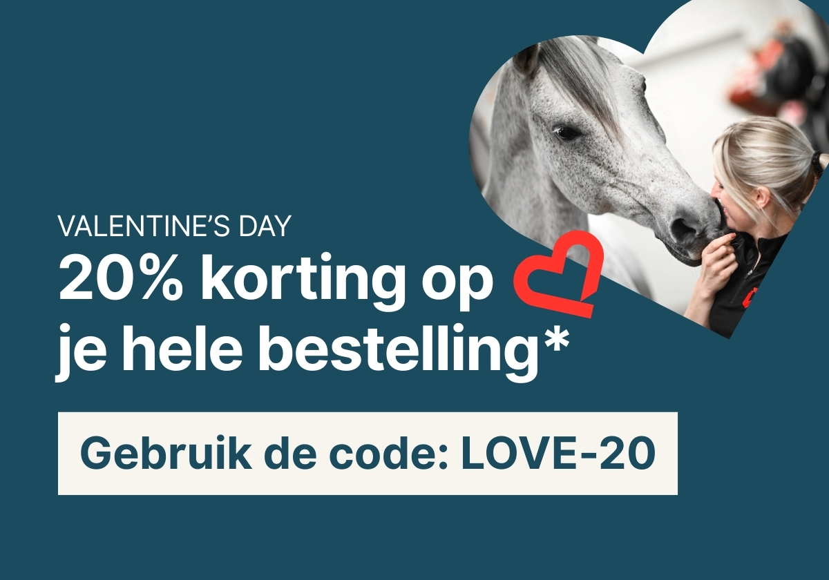 *Geldig t/m 16-02-2026. Kan niet worden gecombineerd met andere kortingscodes, afgeprijsde producten en geldt niet voor verzendkosten. De volgende merken zijn uitgesloten: Kentucky Horsewear, Grooming Deluxe by Kentucky, Kingsland, Pikeur, Eskadron, Racesafe, Uvex, Boss Equestrian, HKM, Horseware, Schockemöhle Sports, Aesculap, Samshield, Dyon, Birth Alarm, Ariat, Freejump, EGO7 & KEP Italia.