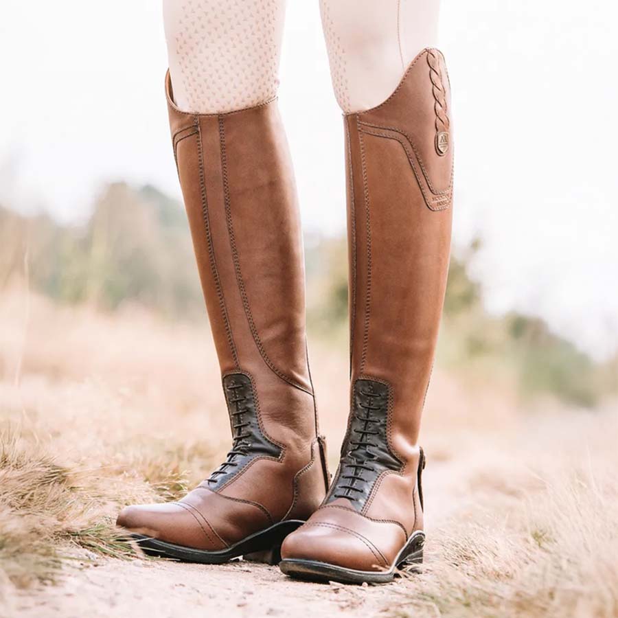 De Valkyria rijlaarzen van Mountain Horse zijn vervaardigd van zacht, bruin premium leer en uitgerust met het Vertycore Advanced Sole System voor uitstekende schokabsorptie, grip en stabiliteit. De Valkyria heeft tevens een elastische vetersluiting aan de voorkant, decoratieve details bovenaan de schacht, en een ritsbeschermer en spoorhouder aan de achterkant.