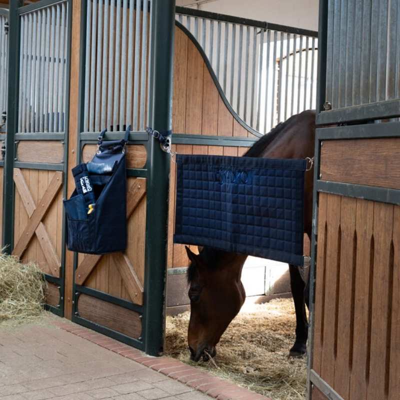 De Eskadron Boxstop Short is een praktische en gevoerde boxgordijn in marineblauw, ontworpen om aan de opening van de staldeur te worden bevestigd. Het biedt een comfortabele en veilige afscheiding voor je paard, terwijl het zorgt voor betere luchtcirculatie en meer zicht dan een gesloten deur. Het gewatteerde ontwerp zorgt voor extra stabiliteit en duurzaamheid, terwijl de verstelbare riemen een eenvoudige en stevige bevestiging mogelijk maken in verschillende stalomgevingen. Met een formaat van 95 x 50 cm is het gemakkelijk te hanteren en geschikt voor dagelijks gebruik.