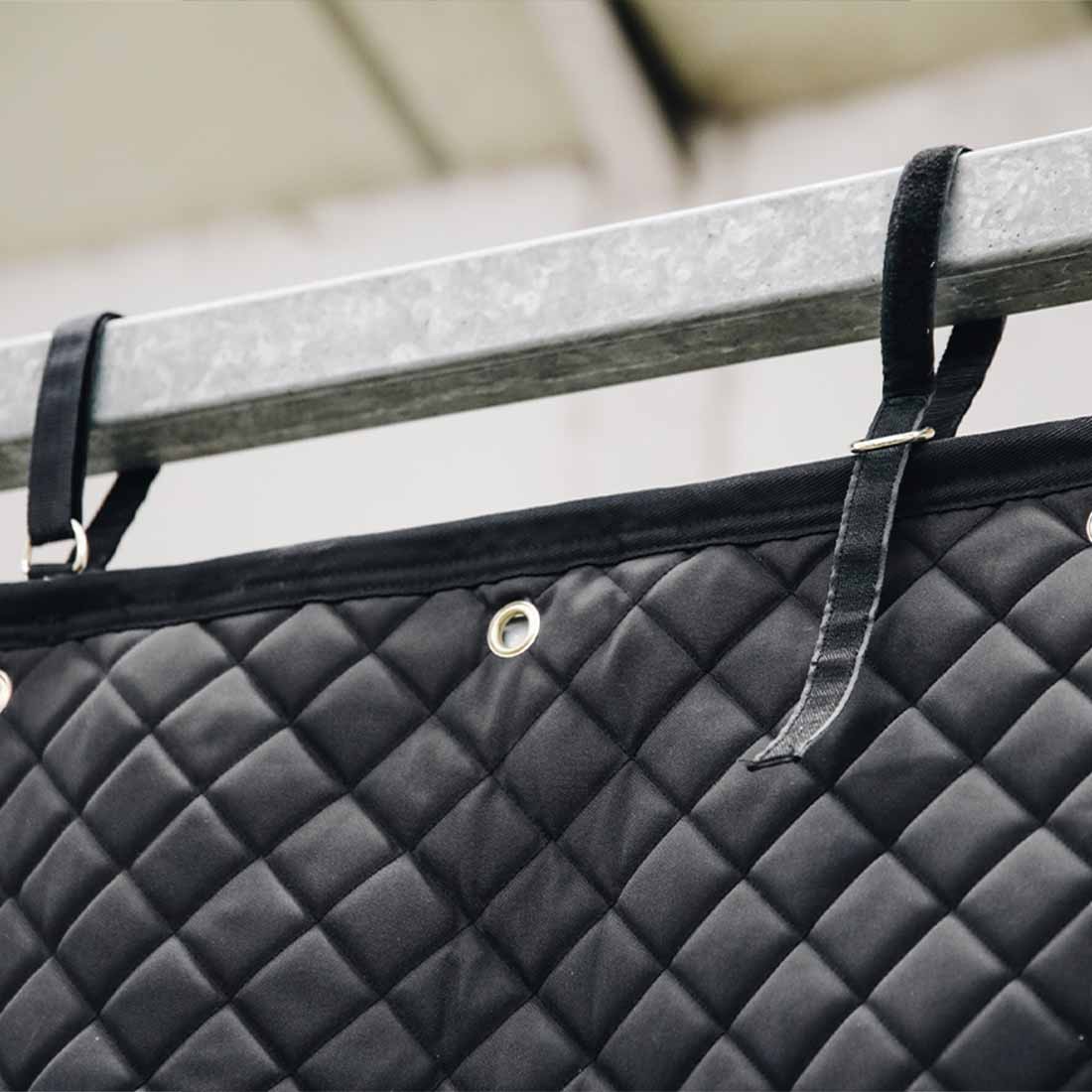 Zwarte, hoogwaardige boxgordijn van Kentucky, waterdicht, verbetert het welzijn van het paard door welverdiende rust in de box te bieden. Het boxgordijn, uitgerust met 5 verborgen karabijnhaken voor het ophangen van apparatuur en accessoires, wordt eenvoudig aan de boxwand gehangen met behulp van 5 geïntegreerde, versterkte ophangringen. Het luxueus doorgestikte patroon, samen met de subtiele details in imitatieleer, geeft ook een echt exclusief gevoel.