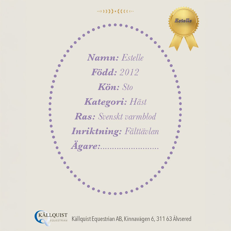 Estelle is een bruine stokpaard met een witte ster op het voorhoofd en is gebaseerd op het Zweeds Warmbloed ras. Het stokpaard is gemaakt van polyester, met een manen en voorpluk van garen die gemakkelijk te vlechten zijn. De stok is gemaakt van espenhout, een lichtgewicht hout dat voor een goede balans zorgt tijdens het gebruik.