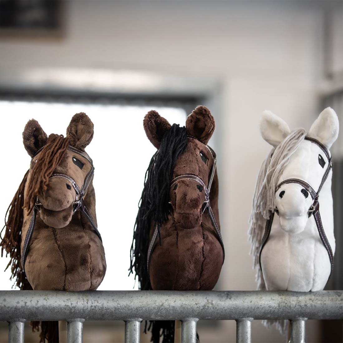 Het stokpaard wordt geleverd met een bijpassend bruin hoofdstel en een gedrukt stamboek. De totale lengte is 80 cm, inclusief de kop van het paard en de houten stok.