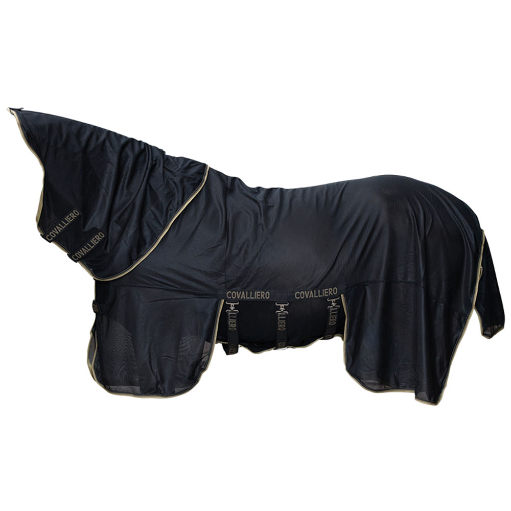 Zwarte vliegendeken van duurzaam, dicht geweven meshmateriaal dat effectieve bescherming biedt tegen vliegen en andere hinderlijke insecten. Het materiaal is ademend met een goede luchtcirculatie, wat helpt om een aangename temperatuur te behouden, zelfs op warmere dagen. Daarnaast is het UV-bestendig en biedt het extra bescherming tegen de zon.